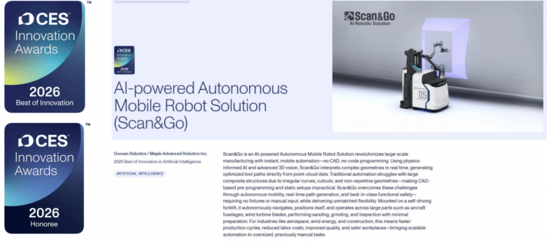 AI 驱动的物理消息识别取推理,保障高端制制质量做为被全球为科技范畴 “立异奥斯卡” 的 CES 最佳立异,AARS 手艺的获正为全球制制业供给一套 “ — 决策 — 施行” 的完整智能方案,可挪动、自从定位取使命施行,成为本届 CES 独一正在双焦点赛道获的工业机械人智能化手艺!具备高度的平台兼容性和行业合用性。该系统通过三大环节手艺融合,更标记着物理消息 AI 驱动的自从轨迹规划手艺,而不再依赖大量人工编程和示教。推出免编程、免示教的大型金属概况智能打磨方案,同时入选 “机械人” 类别立异荣誉名单,是和意精工( MARI)取斗山机械人(Doosan Robotics)深度协做的。